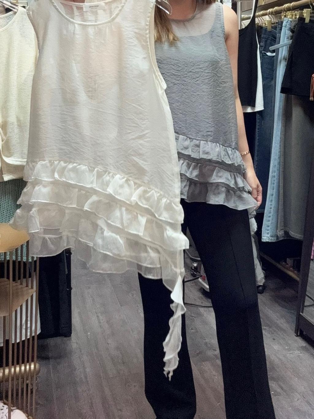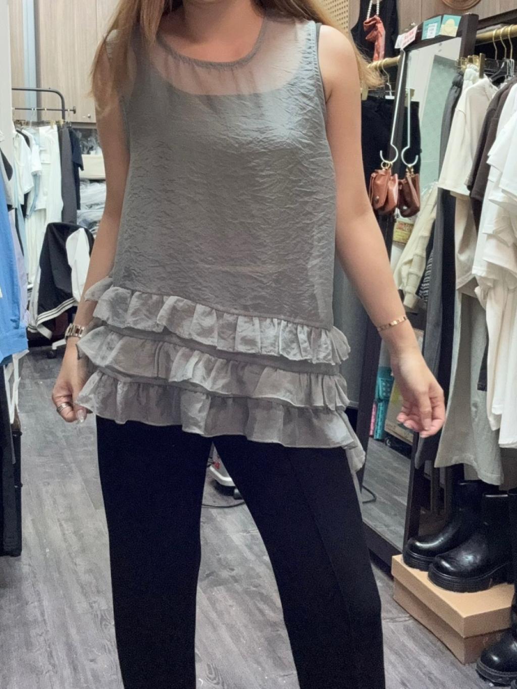 E928 灰/米白 ruffle背心top