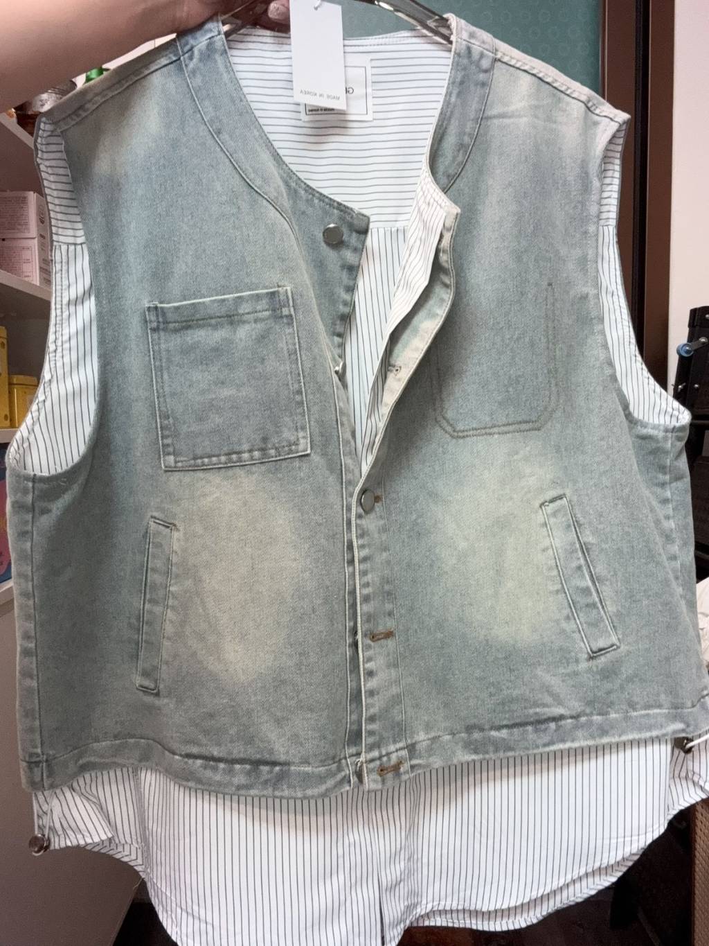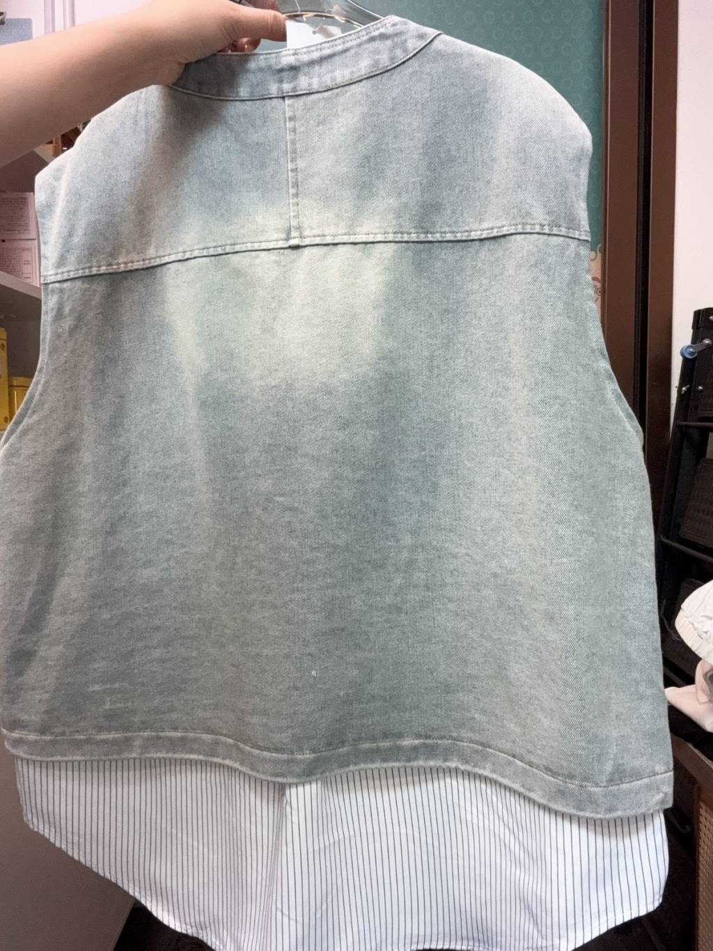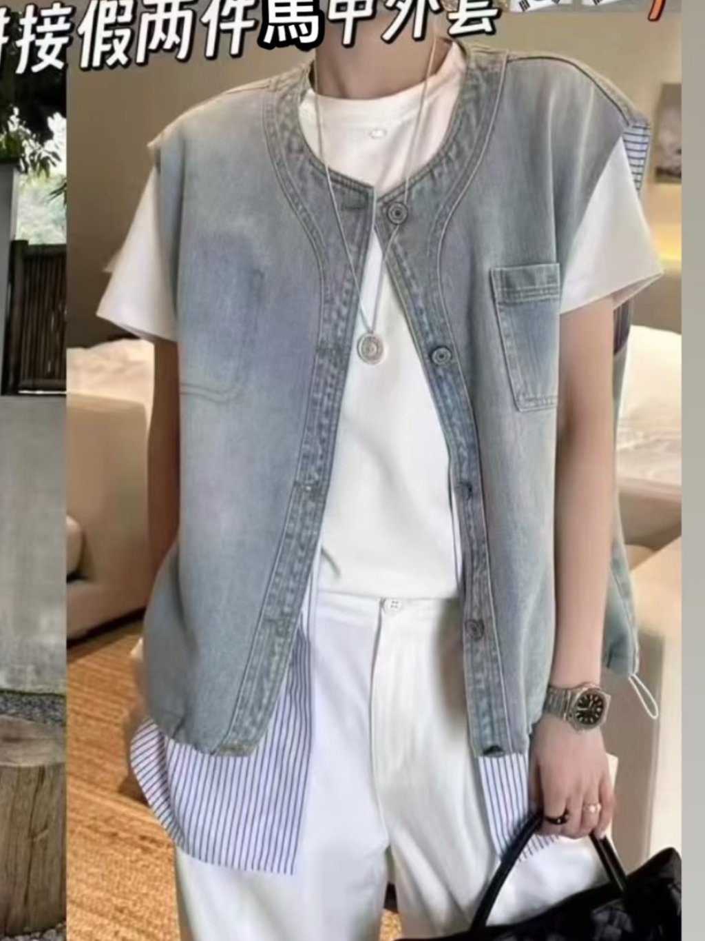 主頁 H046 假兩件牛仔拼直條恤背心外套